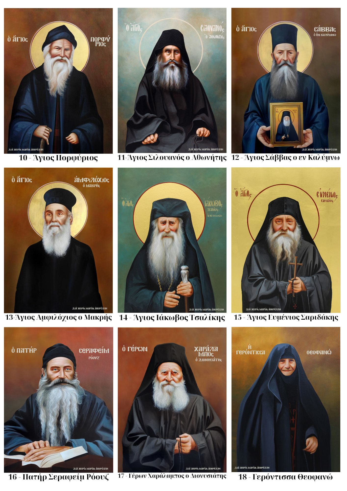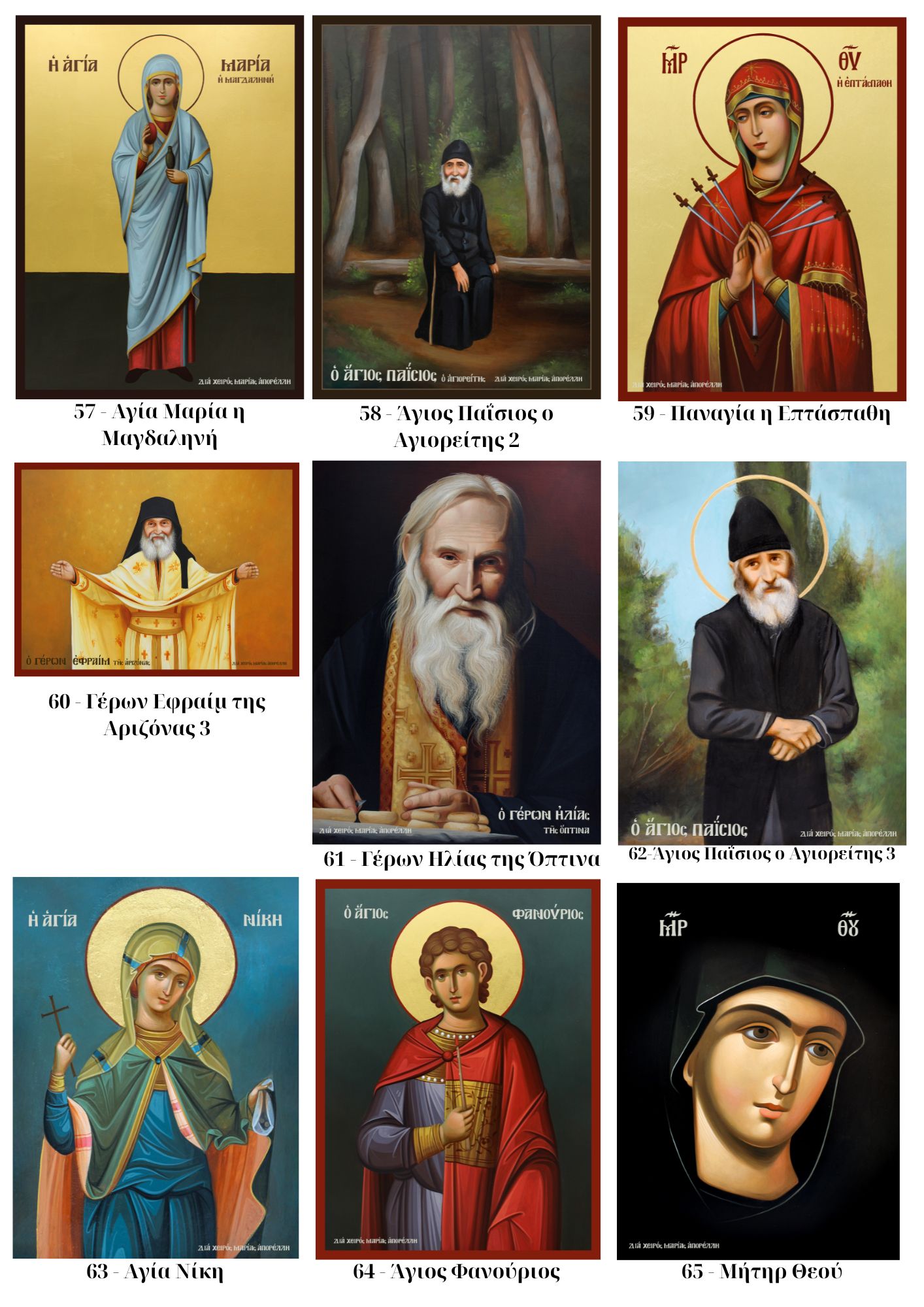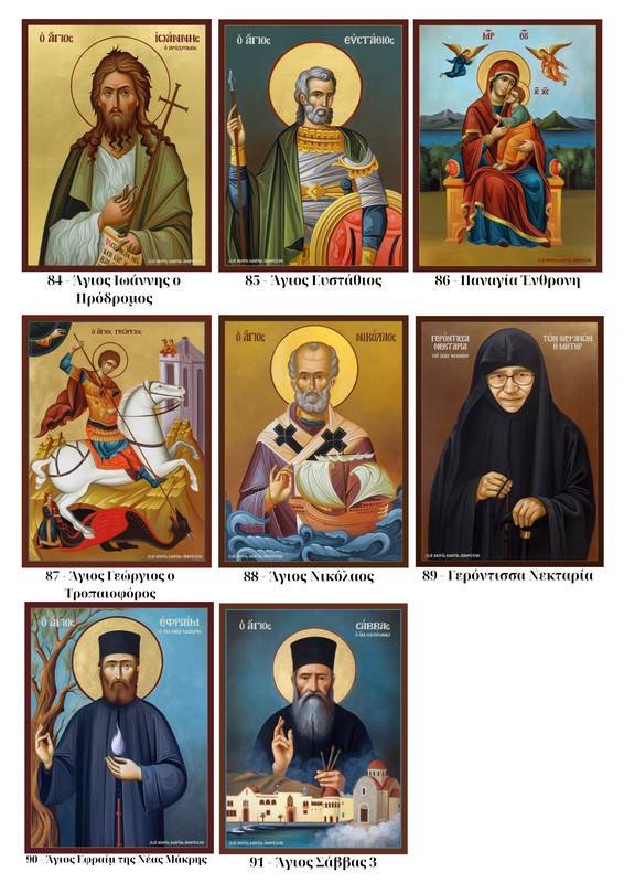 | Επιλογή Αγίου | Κωδικός 1 – Άγιος Άνθιμος ο εν Χίο, Κωδικός 2 – Άγιος Παΐσιος ο Αγιορείτης, Κωδικός 3 – Όσιος Σωφρόνιος του Έσσεξ, Κωδικός 5 – Άγιος Νικηφόρος ο Λεπρός, Κωδικός 4 – Όσιος Ιερώνυμος ο εν Αιγίνη, Κωδικός 6 – Όσιος Ιάκωβος, Κωδικός 7 – Άγιος Ιωσήφ ο Ηχυχαστής, Κωδικός 8 – Άγιος Λουκάς ο Ιατρός, Κωδικός 9 – Όσιος Εφραίμ ο Κατουνακιώτης, Κωδικός 10 – Άγιος Πορφύριος, Κωδικός 11 – Άγιος Σιλουανός ο Αθωνήτης, Κωδικός 12 – Άγιος Σάββας ο εν Καλύμνω, Κωδικός 13 – Άγιος Αμφιλόχιος ο Μακρής, Κωδικός 14 – Άγιος Ιάκωβος Τσαλίκης, Κωδικός 15 – Άγιος Ευμένιος Σαριδάκης, Κωδικός 16 – Πατήρ Σεραφείμ Ρόουζ, Κωδικός 17 – Γέρων Χαράλαμπος ο Διονυσιάτης, Κωδικός 18 – Γερόντισσα Θεοφανώ, Κωδικός 19 – Γέροντας Φιλόθεος Ζερβάκος, Κωδικός 20 – Γέρων Νεκτάριος Βιτάλης, Κωδικός 21 – Γέρων Παύλος Νικηταράς, Κωδικός 22 – Γέρων Εφραίμ Ξηροποταμινός, Κωδικός 23 – Γέρων Εφραίμ της Αριζόνας, Κωδικός 24 – Γέρων Ιωσήφ ο Βατοπαιδινός 2, Κωδικός 25 – Γέρων Ιωσήφ ο Βατοπαιδινός, Κωδικός 26 – Αναγεννησιακή Παναγία, Κωδικός 27 – Αναγεννησιακός Ιησούς Χριστός, Κωδικός 28 – Βυνζαντινή Παναγία, Κωδικός 29 – Θεοτόκος, Κωδικός 30 – Μοναχός, Κωδικός 32 – Αγία Αικατερίνη, Κωδικός 33 – Αγία Ευδοκία, Κωδικός 34 – Παναγία η Γερόντισσα, Κωδικός 35 – Άγιος Νεκτάριος, Κωδικός 36 – Αρχάγγελος Γαβριήλ, Κωδικός 37 – Άγιος Σάββας ο εν Καλύμνω 2, Κωδικός 38 – Παναγία Ελεούσα, Κωδικός 39 – Άγιος Αντώνιος, Κωδικός 40 – Η Βαϊοφόρος, Κωδικός 41 – Όσιος Αρσένιος ο Σπηλαιώτης, Κωδικός 43 – Άγιος Νεκτάριος 2, Κωδικός 44 – Αγία Ξανθίππη, Κωδικός 45 – Γέρων Εφραίμ της Αριζόνας 2, Κωδικός 46 – Οσία Γαβριηλία, Κωδικός 47 – 'Οσιος Σωφρόνιος του Έσσεξ 2, Κωδικός 48 – Γέρων Ιωαννίκιος Διονυσιάτης, Κωδικός 49 – Παναγία Σεκογιανή, Κωδικός 50 – Παναγία Θεόνυμφη, Κωδικός 51 – Παναγία Άξιον Εστί, Κωδικός 52 – Παναγία η Τσαμπίκα, Κωδικός 53 – Αρχάγγελος Μιχαήλ Πανορμίτης της Σύμης, Κωδικός 54 – Αγία Γενοβέφα, Κωδικός 55 – Αρχάγγελος Μιχαήλ Μανταμάδου, Κωδικός 56 – Γερόντισσα Μακρίνα της Πορταριάς, Κωδικός 57 – Η Αγία Μαρία η Μαγδαληνή, Κωδικός 58 – Άγιος Παΐσιος ο Αγιορείτης 2, Κωδικός 59 – Παναγία η Επτάσπαθη, Κωδικός 60 – Γέρων Εφραίμ της Αριζόνας 3, Κωδικός 61 – Γέρων Ηλίας της Όπτινα, Κωδικός 62 – Άγιος Παΐσιος ο Αγιορείτης 3, Κωδικός 63 – Αγία Νίκη, Κωδικός 64 – Άγιος Φανούριος, Κωδικός 65 – Μήτηρ Θεού, Κωδικός 66 – Άγιος Βασίλειος ο Μέγας, Κωδικός 67 – Προφήτης Ηλίας, Κωδικός 68 – Παναγία η Καζάνσκα, Κωδικός 69 – Άγιος Ανδρέας, Κωδικός 70 – Άγιος Πέτρος, Κωδικός 71 – Άγιος Γεώργιος, Κωδικός 72 – Προφήτης Ηλίας 2, Κωδικός 73 – Άγιος Στυλιανός, Κωδικός 74 – Παναγία η Οδηγήτρια, Κωδικός 75 – Αρχάγγελος Μιχαήλ, Κωδικός 76 – Άγιος Δημήτριος, Κωδικός 77 – Αγία Ραλία, Κωδικός 78 – Αγία Ειρήνη, Κωδικός 79 – Άγιος Αθανάσιος, Κωδικός 80 – Αρχιεπίσκοπος Αναστάσιος, Κωδικός 81 – Μοναχός 2, Κωδικός 82 – Ιησούς Χριστός, Κωδικός 83 – Παναγία η Θαλασσινή, Κωδικός 84 – Άγιος Ιωάννης ο Πρόδρομος, Κωδικός 85 – Άγιος Ευστάθιος, Κωδικός 86 – Παναγία Ένθρονη, Κωδικός 87 – Άγιος Γεώργιος ο Τροπαιοφόρος, Κωδικός 88 – Άγιος Νικόλαος, Κωδικός 89 – Γερόντισσα Νεκταρία, Κωδικός 90 – Άγιος Εφραίμ της Νέας Μάκρης, Κωδικός 91 – Άγιος Σάββας 3 |