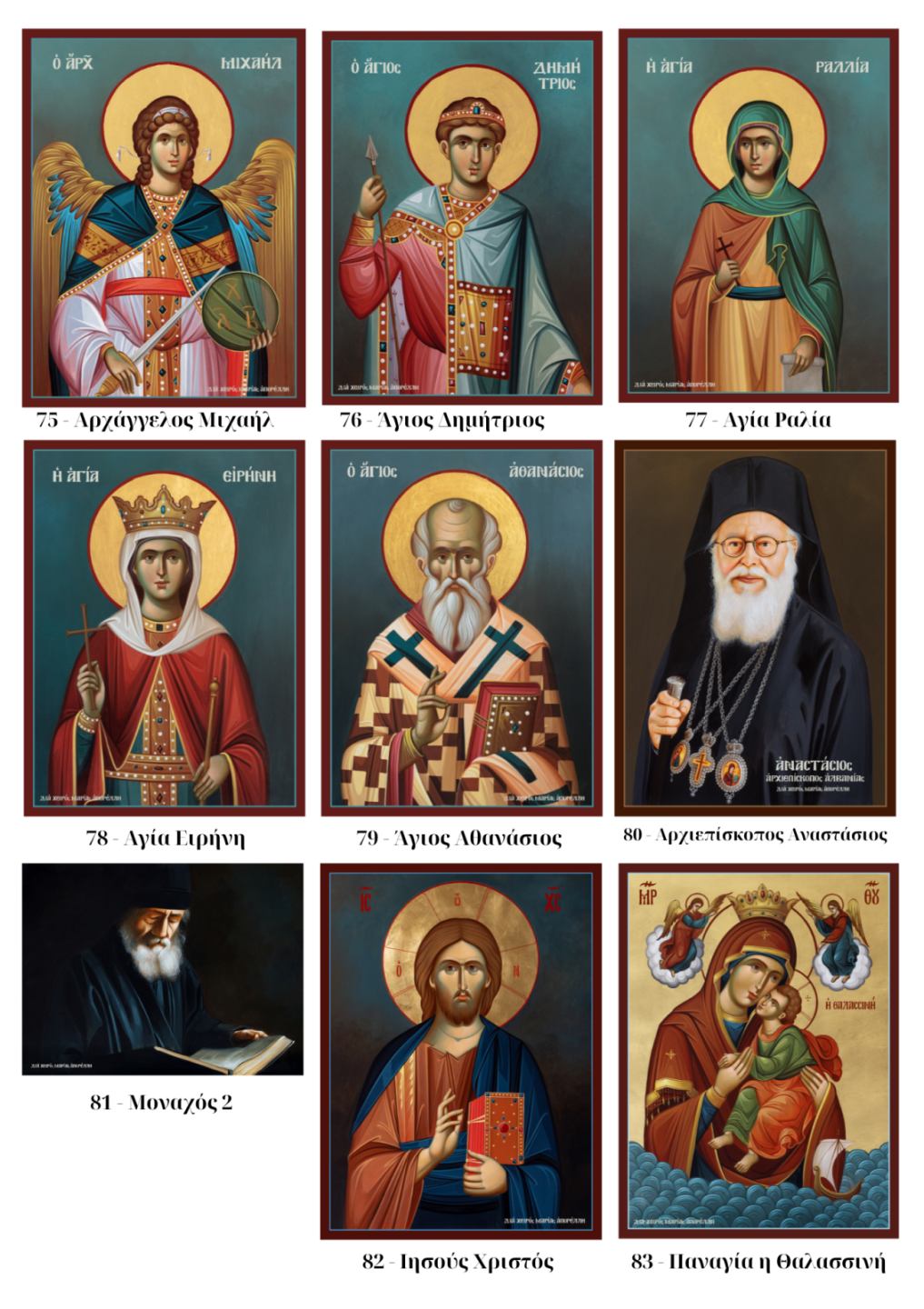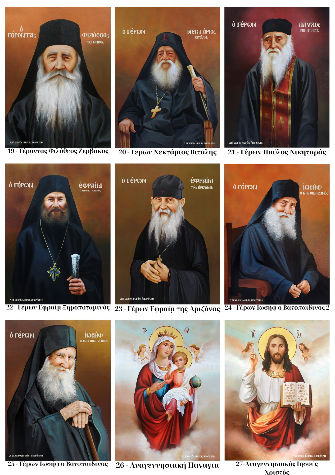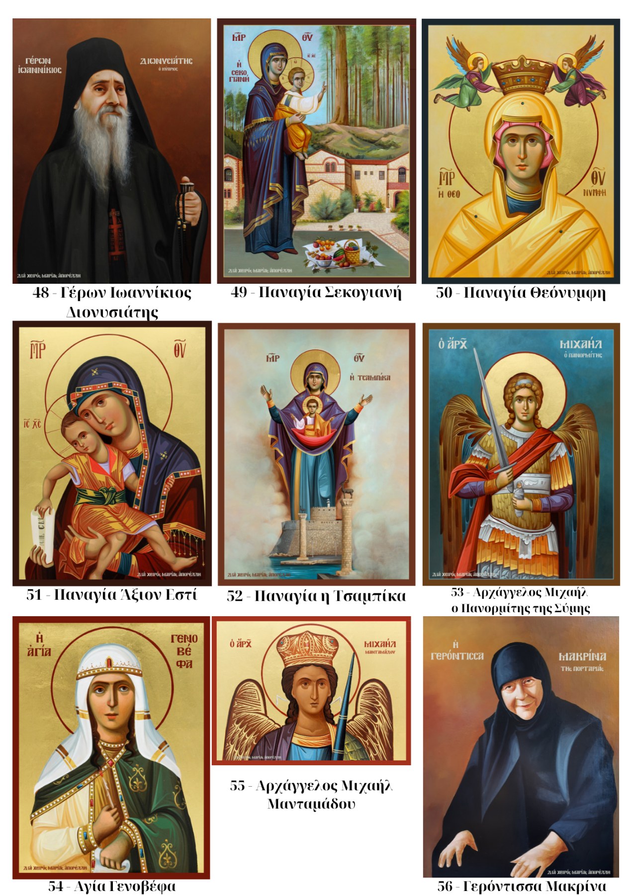 | Επιλογή Αγίου | Κωδικός 1 – Άγιος Άνθιμος ο εν Χίο, Κωδικός 2 – Άγιος Παΐσιος ο Αγιορείτης, Κωδικός 3 – Όσιος Σωφρόνιος του Έσσεξ, Κωδικός 5 – Άγιος Νικηφόρος ο Λεπρός, Κωδικός 4 – Όσιος Ιερώνυμος ο εν Αιγίνη, Κωδικός 6 – Όσιος Ιάκωβος, Κωδικός 7 – Άγιος Ιωσήφ ο Ηχυχαστής, Κωδικός 8 – Άγιος Λουκάς ο Ιατρός, Κωδικός 9 – Όσιος Εφραίμ ο Κατουνακιώτης, Κωδικός 10 – Άγιος Πορφύριος, Κωδικός 11 – Άγιος Σιλουανός ο Αθωνήτης, Κωδικός 12 – Άγιος Σάββας ο εν Καλύμνω, Κωδικός 13 – Άγιος Αμφιλόχιος ο Μακρής, Κωδικός 14 – Άγιος Ιάκωβος Τσαλίκης, Κωδικός 15 – Άγιος Ευμένιος Σαριδάκης, Κωδικός 16 – Πατήρ Σεραφείμ Ρόουζ, Κωδικός 17 – Γέρων Χαράλαμπος ο Διονυσιάτης, Κωδικός 18 – Γερόντισσα Θεοφανώ, Κωδικός 19 – Γέροντας Φιλόθεος Ζερβάκος, Κωδικός 20 – Γέρων Νεκτάριος Βιτάλης, Κωδικός 21 – Γέρων Παύλος Νικηταράς, Κωδικός 22 – Γέρων Εφραίμ Ξηροποταμινός, Κωδικός 23 – Γέρων Εφραίμ της Αριζόνας, Κωδικός 24 – Γέρων Ιωσήφ ο Βατοπαιδινός 2, Κωδικός 25 – Γέρων Ιωσήφ ο Βατοπαιδινός, Κωδικός 26 – Αναγεννησιακή Παναγία, Κωδικός 27 – Αναγεννησιακός Ιησούς Χριστός, Κωδικός 28 – Βυνζαντινή Παναγία, Κωδικός 29 – Θεοτόκος, Κωδικός 30 – Μοναχός, Κωδικός 32 – Αγία Αικατερίνη, Κωδικός 33 – Αγία Ευδοκία, Κωδικός 34 – Παναγία η Γερόντισσα, Κωδικός 35 – Άγιος Νεκτάριος, Κωδικός 36 – Αρχάγγελος Γαβριήλ, Κωδικός 37 – Άγιος Σάββας ο εν Καλύμνω 2, Κωδικός 38 – Παναγία Ελεούσα, Κωδικός 39 – Άγιος Αντώνιος, Κωδικός 40 – Η Βαϊοφόρος, Κωδικός 41 – Όσιος Αρσένιος ο Σπηλαιώτης, Κωδικός 43 – Άγιος Νεκτάριος 2, Κωδικός 44 – Αγία Ξανθίππη, Κωδικός 45 – Γέρων Εφραίμ της Αριζόνας 2, Κωδικός 46 – Οσία Γαβριηλία, Κωδικός 47 – 'Οσιος Σωφρόνιος του Έσσεξ 2, Κωδικός 48 – Γέρων Ιωαννίκιος Διονυσιάτης, Κωδικός 49 – Παναγία Σεκογιανή, Κωδικός 50 – Παναγία Θεόνυμφη, Κωδικός 51 – Παναγία Άξιον Εστί, Κωδικός 52 – Παναγία η Τσαμπίκα, Κωδικός 53 – Αρχάγγελος Μιχαήλ Πανορμίτης της Σύμης, Κωδικός 54 – Αγία Γενοβέφα, Κωδικός 55 – Αρχάγγελος Μιχαήλ Μανταμάδου, Κωδικός 56 – Γερόντισσα Μακρίνα της Πορταριάς, Κωδικός 57 – Η Αγία Μαρία η Μαγδαληνή, Κωδικός 58 – Άγιος Παΐσιος ο Αγιορείτης 2, Κωδικός 59 – Παναγία η Επτάσπαθη, Κωδικός 60 – Γέρων Εφραίμ της Αριζόνας 3, Κωδικός 61 – Γέρων Ηλίας της Όπτινα, Κωδικός 62 – Άγιος Παΐσιος ο Αγιορείτης 3, Κωδικός 63 – Αγία Νίκη, Κωδικός 64 – Άγιος Φανούριος, Κωδικός 65 – Μήτηρ Θεού, Κωδικός 66 – Άγιος Βασίλειος ο Μέγας, Κωδικός 67 – Προφήτης Ηλίας, Κωδικός 68 – Παναγία η Καζάνσκα, Κωδικός 69 – Άγιος Ανδρέας, Κωδικός 70 – Άγιος Πέτρος, Κωδικός 71 – Άγιος Γεώργιος, Κωδικός 72 – Προφήτης Ηλίας 2, Κωδικός 73 – Άγιος Στυλιανός, Κωδικός 74 – Παναγία η Οδηγήτρια, Κωδικός 75 – Αρχάγγελος Μιχαήλ, Κωδικός 76 – Άγιος Δημήτριος, Κωδικός 77 – Αγία Ραλία, Κωδικός 78 – Αγία Ειρήνη, Κωδικός 79 – Άγιος Αθανάσιος, Κωδικός 80 – Αρχιεπίσκοπος Αναστάσιος, Κωδικός 81 – Μοναχός 2, Κωδικός 82 – Ιησούς Χριστός, Κωδικός 83 – Παναγία η Θαλασσινή, Κωδικός 84 – Άγιος Ιωάννης ο Πρόδρομος, Κωδικός 85 – Άγιος Ευστάθιος, Κωδικός 86 – Παναγία Ένθρονη, Κωδικός 87 – Άγιος Γεώργιος ο Τροπαιοφόρος, Κωδικός 88 – Άγιος Νικόλαος, Κωδικός 89 – Γερόντισσα Νεκταρία, Κωδικός 90 – Άγιος Εφραίμ της Νέας Μάκρης, Κωδικός 91 – Άγιος Σάββας 3 |