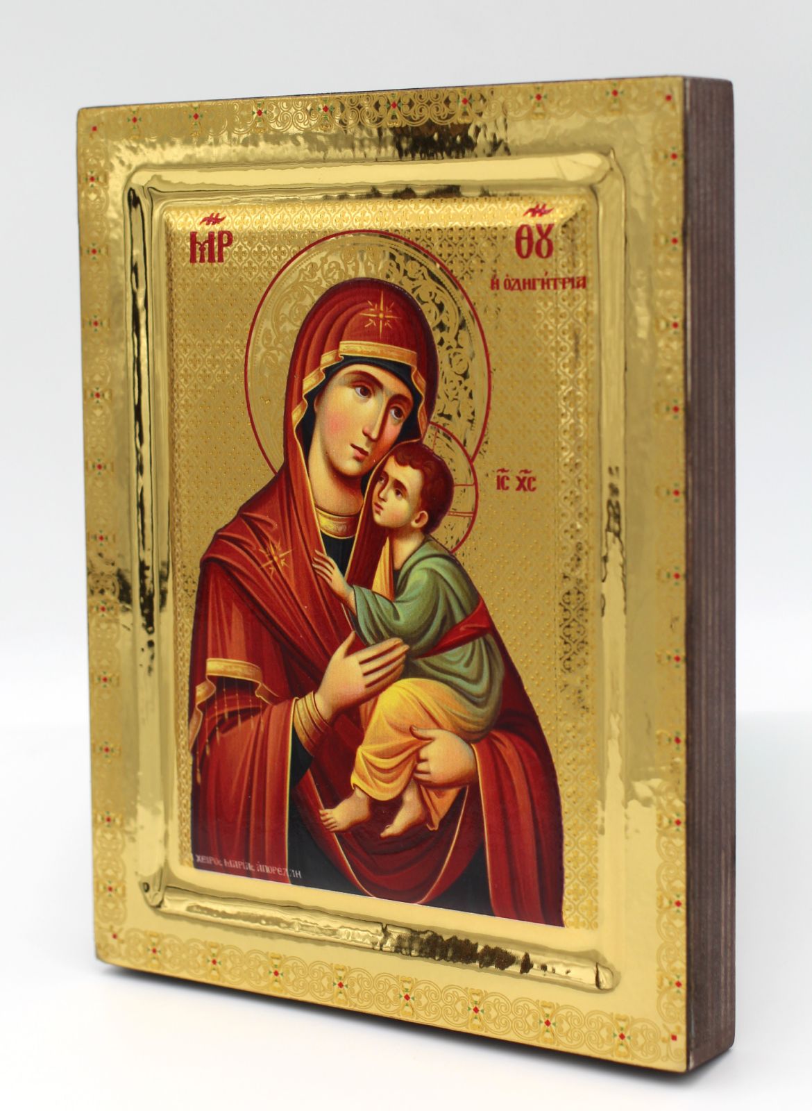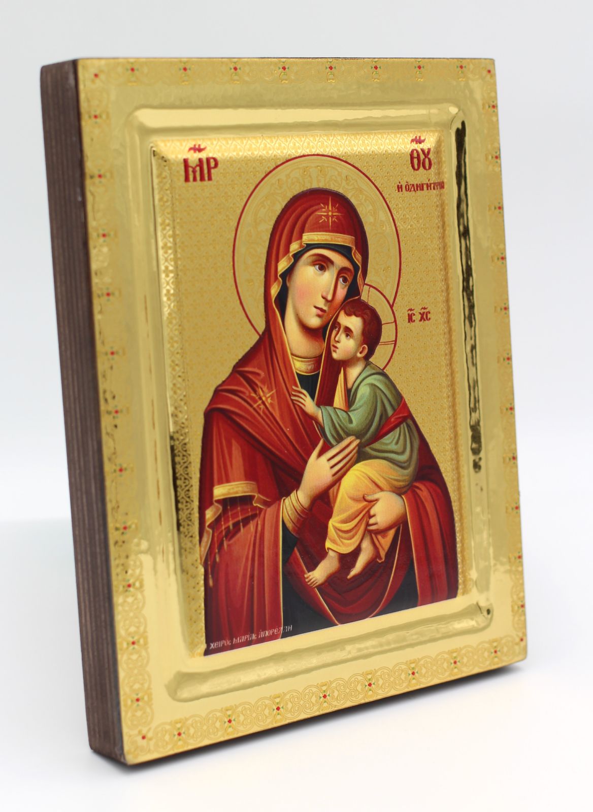Εικόνα σε σκαφτή ξύλινη επιφάνεια με όψη στιλβωτού και διακόσμηση σαν τσουκάνικο.