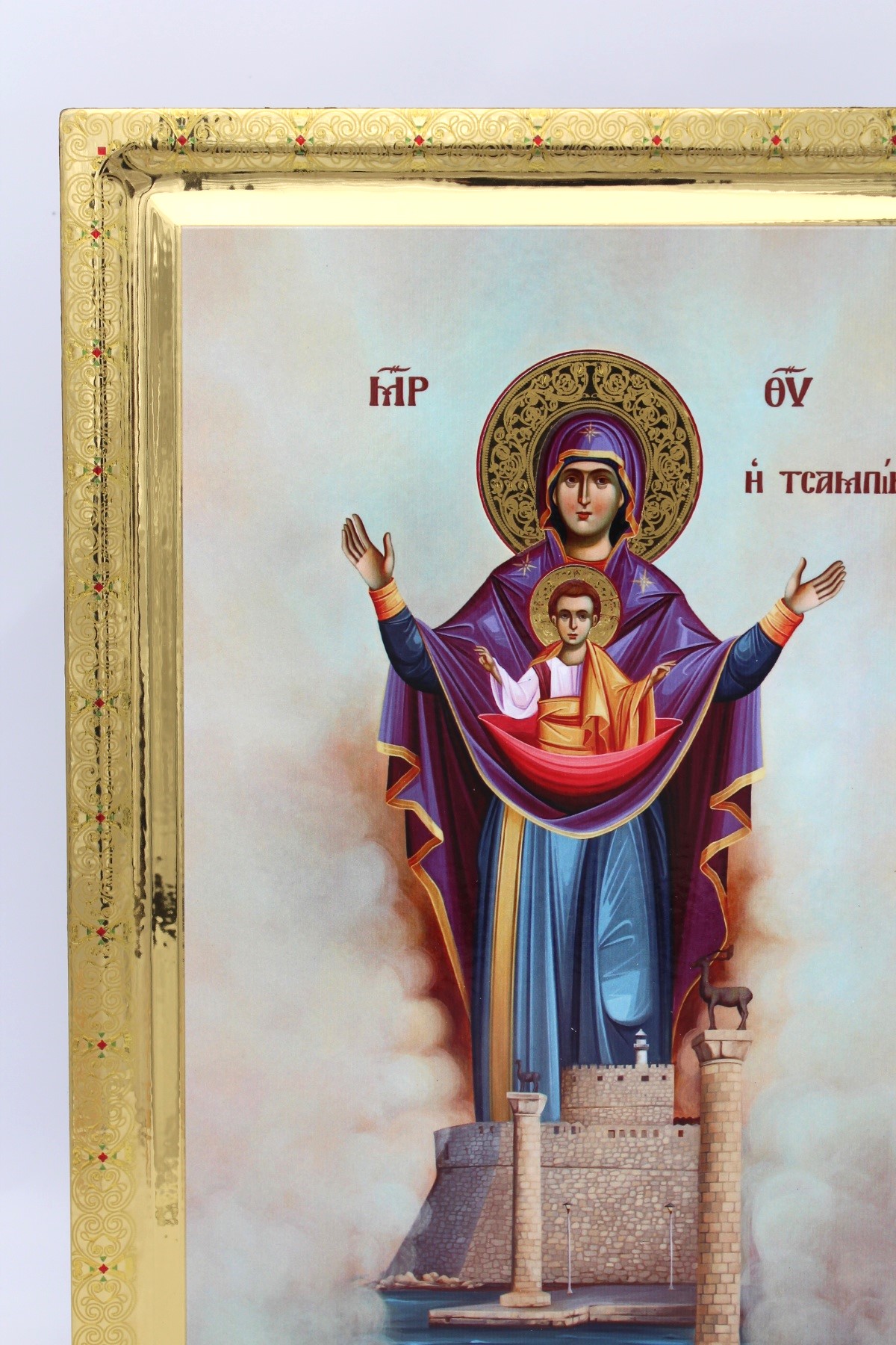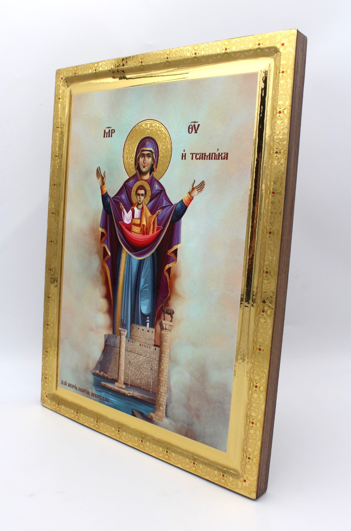 Εικόνα σε σκαφτή ξύλινη επιφάνεια με όψη στιλβωτού και διακόσμηση σαν τσουκάνικο.